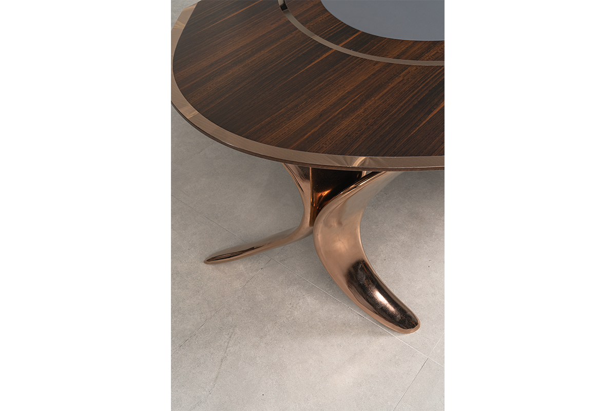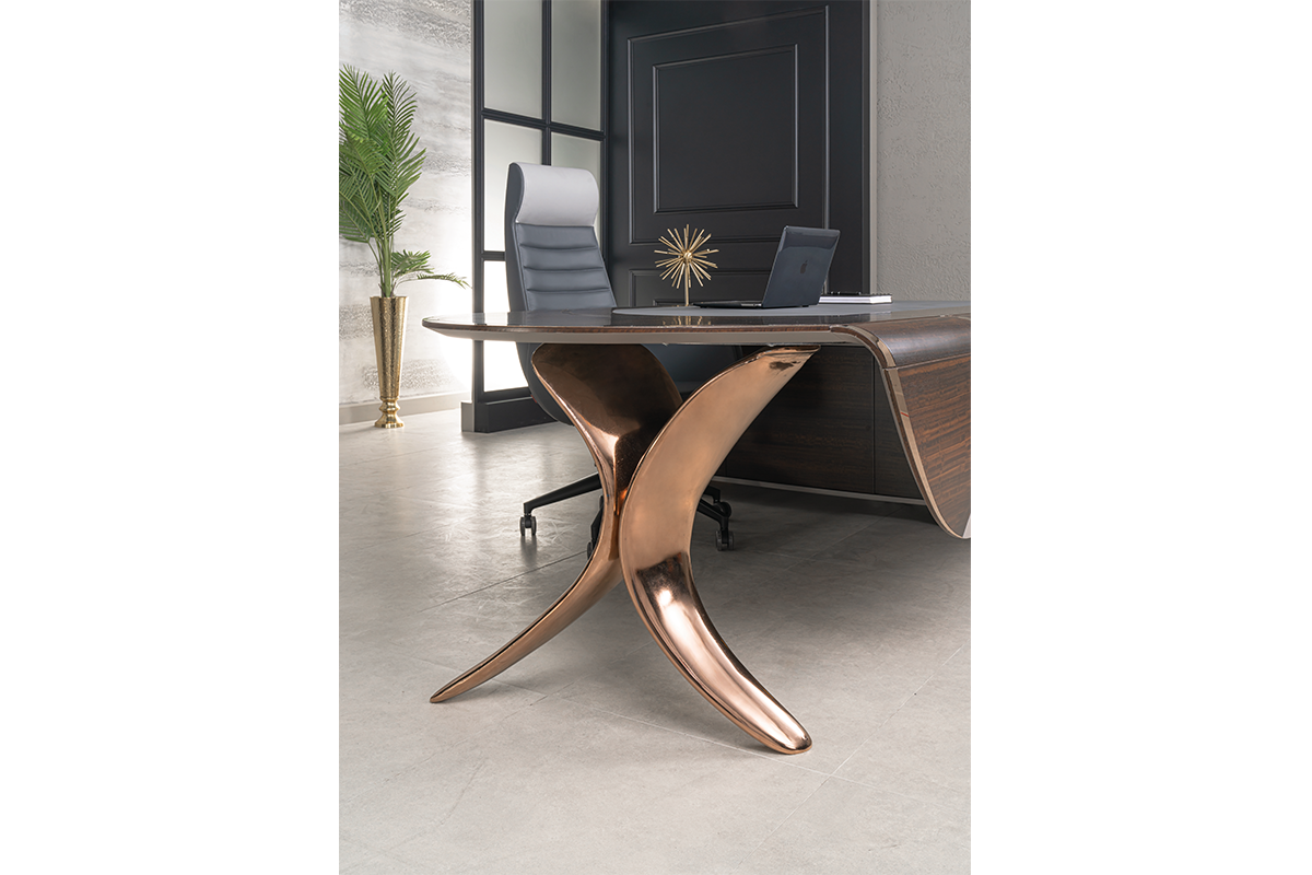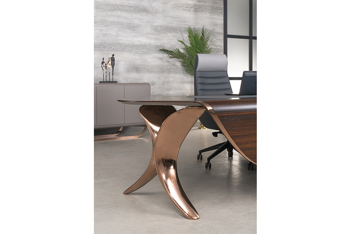Tasarımda, gelecek kurgumuzun en modern yansımasıdır. Segmentlerin algılarını yıkarak yeni bir alan açtığımız, genel kabul görmüş kriterleri altüst ettiğimiz bir tasarımdır. Asimetrik ve akışkan yapısıyla alışılmışın dışındadır. Genel yapısında DNA sarmallarının hareketlerini göreceksiniz. Modern yaklaşımdan ödün vermeden, malzeme seçiminde kalite ve lüks algısını ortaya koyduk. Tamamen doğal kaplama masif ve yüksek Türk işçiliğiyle cilalanmış; sektördeki en büyük çarpanımız olan hassas işçiliğimizden ve yüksek kalite iddiamızdan ödün vermedik. Tamamen döküm alüminyum ayak yapısı DNA formunu sembolize ederken, dönerek yükselen eğriyi temsil ederek semazenvari bir duruş sergiliyor. Tasarım ekosisteminin öncesi ve sonrasını bir mihenk taşı gibi ayıracak DNA setimizi siz değerli misafirlerimize sunmanın gururunu yaşıyoruz.